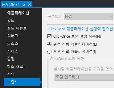 2. 보안에 들어가서 ClickOnce 보안 설정 사용을 체크한다.