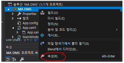 1. 솔루션 탐색기에서 프로젝트를 우클릭하여 속성에 들어간다.