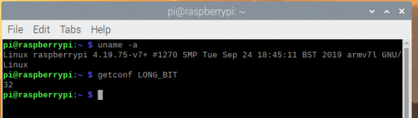 5. 이제 라즈비안으로가서 Terminal 을 열어주시고 "uname -a" 과 "getconf LONG-BIT "를 순차적으로 입력해주세요.