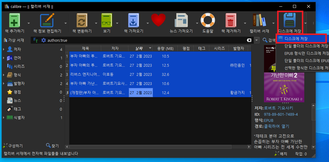 책을 선택하고 도서 내보내기 버튼을 눌러 원하는 파일 형식으로 내보내기 버튼을 누릅니다.